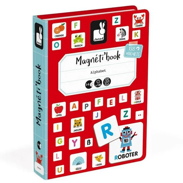 Jeu éducatif magnétique en carton pour apprendre l’alphabet en allemand. Composé de 26 magnets illustrés et de 112 magnets lettres. Une fois le livre ouvert, le but du jeu est d’écrire correctement sur la scène le mot indiqué sur chaque magnet illustré.