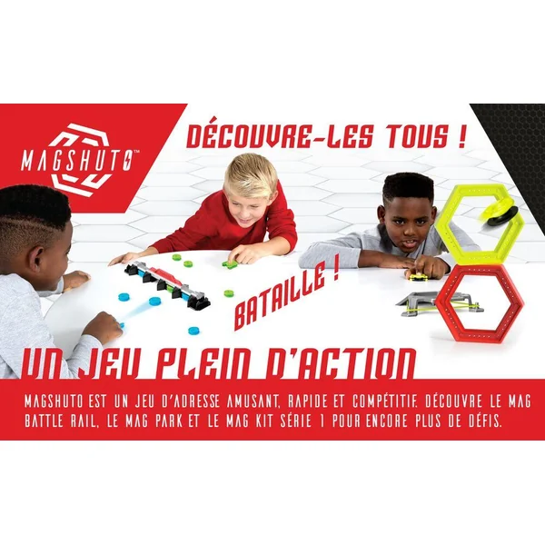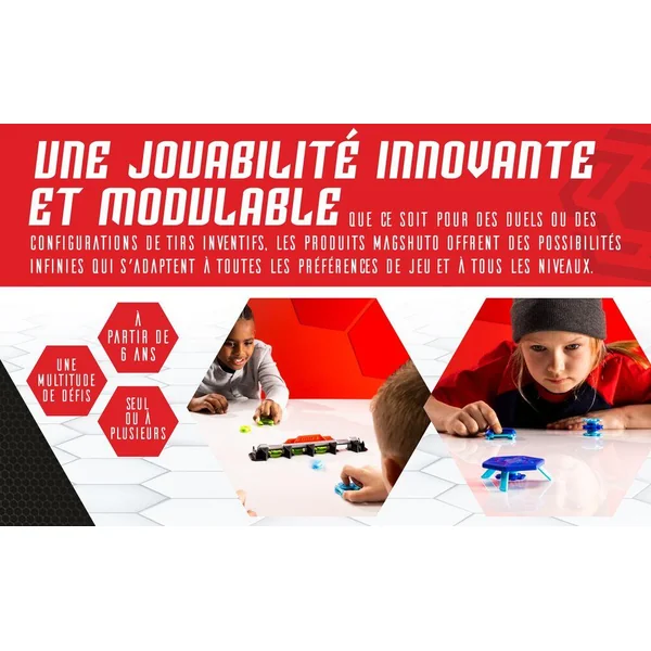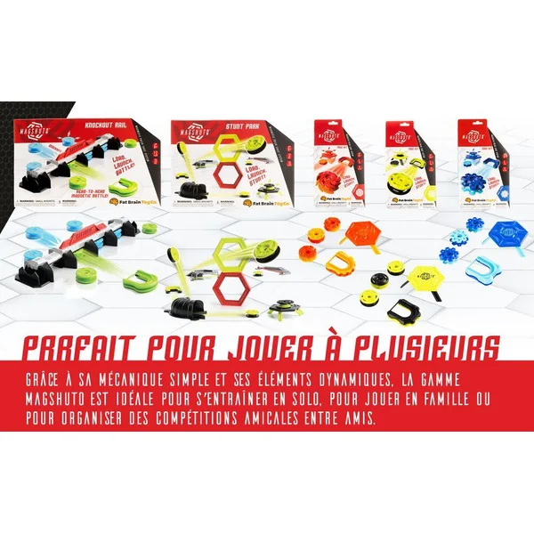 Pour jouer, enclenche le Mag Pod dans le lanceur pour le charger, puis relâche pour lancer ! Pour commencer, réussis les 15 défis proposés. Ensuite, passe à la vitesse supérieure et imagine des cascades magnétiques audacieuses, en inventant sans cesse de nouvelles facons de jouer. Comprend 1 lanceur, 1 module de cascades, 2 anneaux hexagonaux , 1 rampe à tunnel avec virage à 90° et rampe haute, 1 rebondisseur, 5 mag-pods, 1 cible magnétique mag-module et 15 cartes défis. A combiner avec le set Mag Battle Rail pour relever encore plus de défis Magshuto !