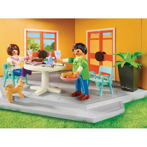 Le set ludique comprend la maison moderne, deux personnages et 1 chien. Ils sont également accompagnés de divers accessoires tels qu’un barbecue, une table, des chaises, un transat, un pot de fleurs Lechuza et de la vaisselle.
