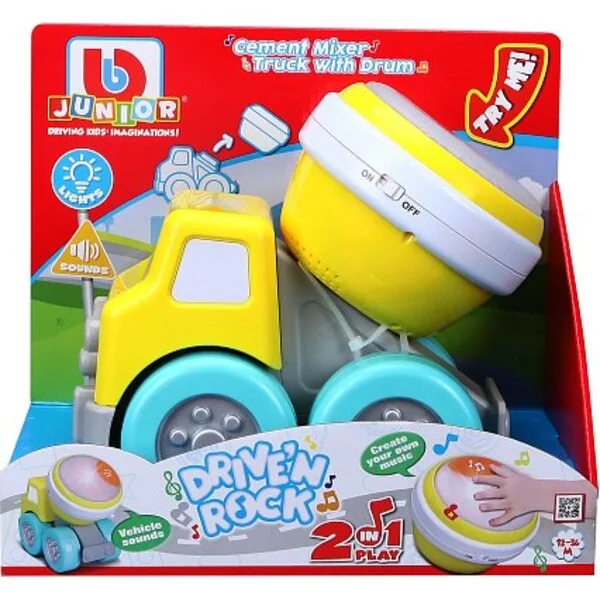 Mixeur à béton avec tambour 2 en 1 de la série Drive’N Rock. Voiture colorée avec tambour amovible.