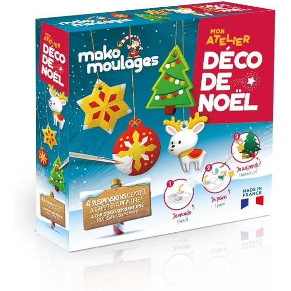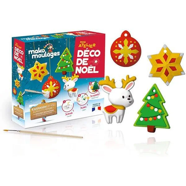 C’est un kit créatif complet pour fabriquer soi même et customiser 4 suspensions à mettre dans le sapin de Noel ! Contient : 1 moule avec 4 empreintes différentes (Renne, étoile, sapin, et boule) – 1 sachet de plâtre – 6 pots de peinture 2.5 ml + 1 pinceau et 4 fils.