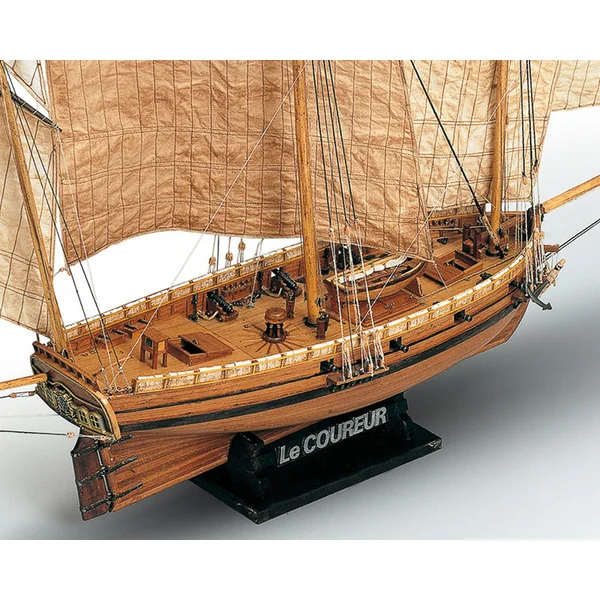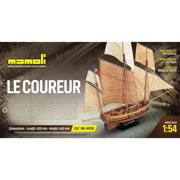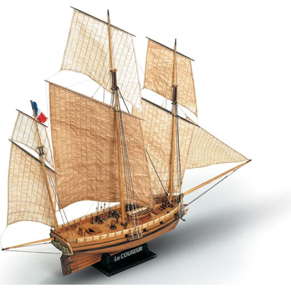 Kit de modélisme d’un modèle de bateau non navigant MAMOLI Le Coureur à l’échelle 1:54 de 1776. Le bateau était populaire en raison de sa manœuvrabilité, notamment parmi les boucaniers et pirates français. Il s’agit d’un « bragozzo » – un type similaire à un bateau de pêche avec deux mâts et une riche voilure. L’emballage contient des pièces en bois, des lattes et de nombreux accessoires, cordages, plans, etc.