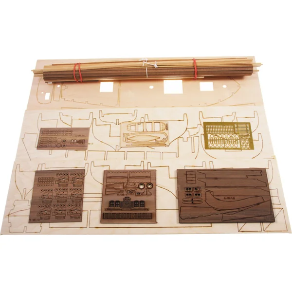 Le modèle est à l’échelle 1:54, longueur 820 mm, hauteur 650 mm. Le kit est aujourd’hui fabriqué avec une technologie laser moderne, garantissant une grande précision dans l’assemblage des pièces. Le double encadrement est standard. De nombreux accessoires en métal coulé ou en bois. Les modèles de bateaux de Mamoli sont populaires depuis plusieurs années. Une large gamme de différents types de modèles et des matériaux classiques caractérisent cette série.