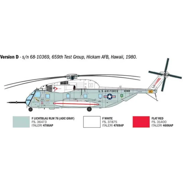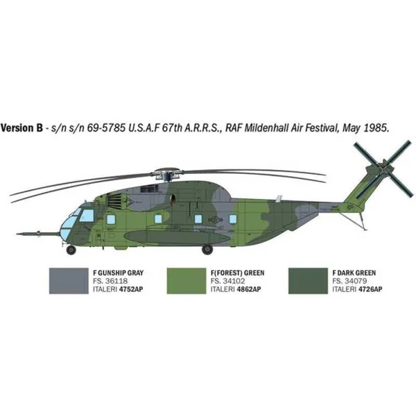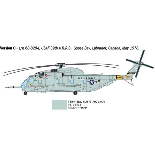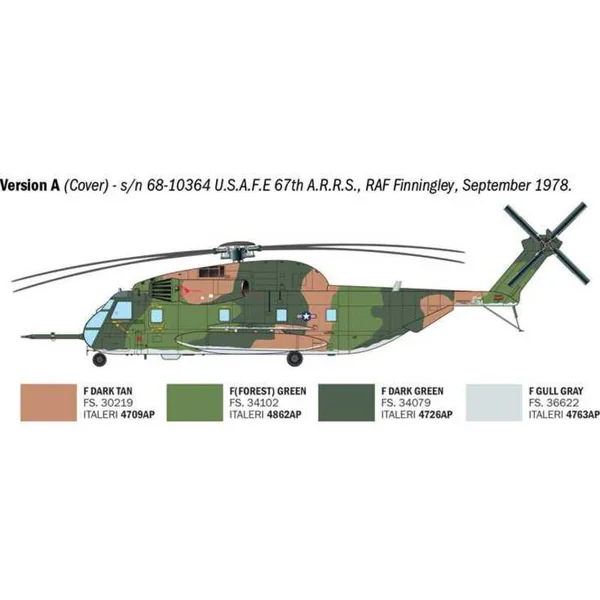 Le HH-53C Jolly Green a été développé par Sikorsky comme une variante de l’hélicoptère lourd CH-53 Sea Stallion. Il est entré en service dans l’armée de l’air américaine à la fin des années 60. Il a été conçu pour effectuer des missions CSAR « Search and Rescue » (recherche et sauvetage) dans des zones de combat avec une grande efficacité opérationnelle. Par rapport à la version précédente, il était équipé d’une sonde de ravitaillement en vol, de réservoirs de carburant supplémentaires, d’un blindage renforcé et de la possibilité d’installer des armes de défense supplémentaires. Une attention particulière a été accordée à l’amélioration des systèmes radio, qui devaient coordonner les activités opérationnelles avec d’autres avions de soutien, tels que des ravitailleurs ou des hélicoptères d’attaque et de soutien, nécessaires pour retrouver en toute sécurité les pilotes abattus ou disparus. Robuste, fiable et avec une longue autonomie de vol, il a été largement utilisé pendant la guerre du Vietnam.