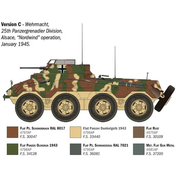 Les véhicules blindés de la série Schwerer Panzerspähwagen Sd.Kfz. 234 ont été fabriqués par l’industrie de guerre allemande dans la phase finale de la Seconde Guerre mondiale. Ils se caractérisaient par une haute qualité de fabrication, une combinaison de mobilité, de flexibilité opérationnelle et de capacités d’attaque. La conception représentait un excellent équilibre entre la vitesse en terrain, la protection et la puissance de feu, et utilisait efficacement l’expérience opérationnelle de la Wehrmacht acquise au cours des premières années du conflit. Sur les routes, le véhicule pouvait atteindre une vitesse maximale de 85 km/h. Parmi les différentes versions produites, le Sd.Kfz. 234/1 servait souvent de véhicule de commandement. Il a également été déployé dans des missions de reconnaissance et était équipé d’un canon de 20 mm KwK 30 monté dans une tourelle ouverte, capable de fournir un soutien de feu à l’infanterie contre des cibles légèrement blindées.