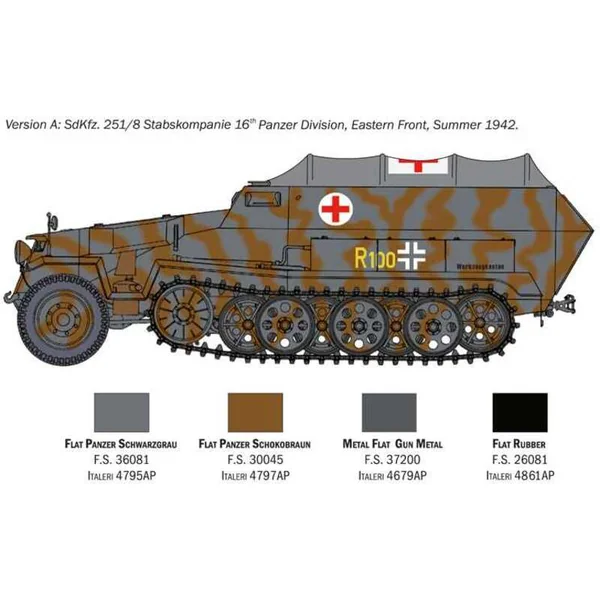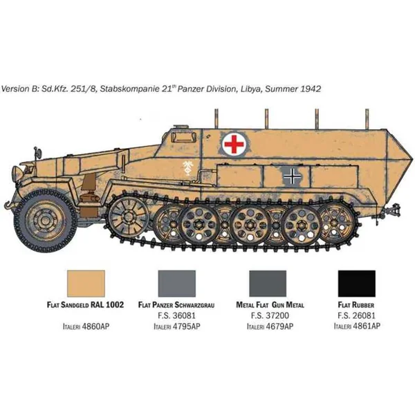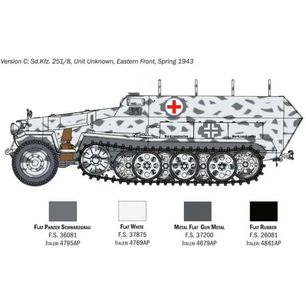 Le véhicule semi-chenillé Sd.Kfz.251 était un véhicule de combat blindé que la Wehrmacht a déployé sur tous les fronts de combat pendant la Seconde Guerre mondiale. Il utilisait un moteur à essence six cylindres Maybach, ce qui lui permettait d’atteindre une vitesse de 55 km/h même en terrain difficile. Il a été produit en grande quantité et était principalement utilisé pour le transport des « Panzergrenadiers ». Cependant, plusieurs versions ont été développées pendant la guerre pour répondre à divers autres besoins opérationnels. La version Sd.Kfz. 251/8 « Krankenpanzerwagen » était équipée et utilisée près de la ligne de front comme ambulance blindée. Elle pouvait transporter jusqu’à huit blessés assis ou quatre blessés assis et deux blessés allongés sur des civières, ainsi que l’équipement nécessaire pour fournir les premiers secours et d’autres fournitures médicales.