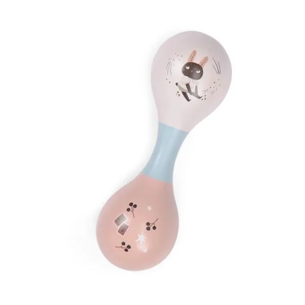 Maracas double en bois peint rose et crème, décorée des illustrations poétiques de la collection Après la pluie, imaginée par Lucille Michieli. Taille conçue pour s’adapter aux petites mains, ce jeu développe le rythme et l’éveil musical des tout-petits.