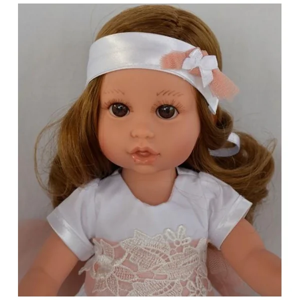Elle porte une belle robe pour sa première communion avec un serre-tête assorti. Son corps est entièrement en plastique vinyle.