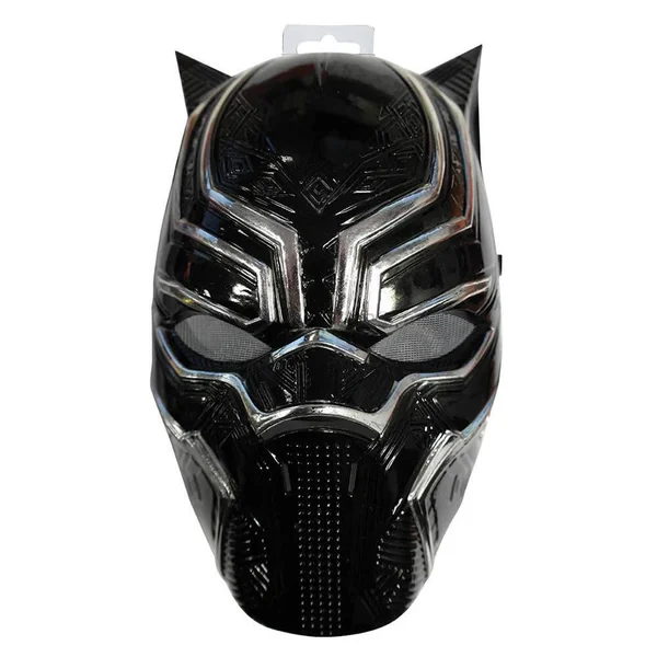Un masque en PVC noir et argenté à l’effigie du super-héros Black Panther. Attache élastique et système de fermeture velcro à l’arrière. Ouvertures pour les yeux.
