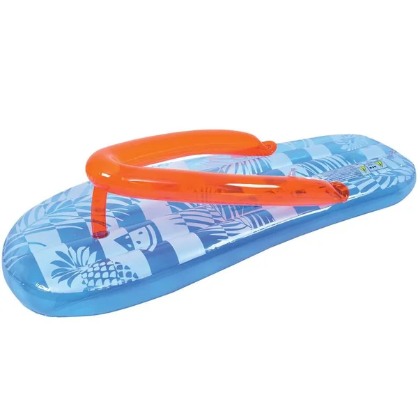 Matelas gonflable en forme de tong avec des fruits imprimés sur le dessus. En vinyle (0.24 mm). 2 chambres à air pour plus de sécurité. 1 rustine de réparation incluse. Pour une personne uniquement. Poids maximum de l’utilisateur : 80 kg. Ce produit n’est pas un jouet.