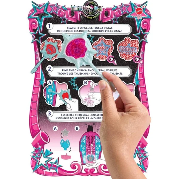 - Fixez le talisman au bas du placard, puis faites-le glisser vers le haut comme une fermeture éclair pour révéler la poupée Catty Noir dans un look de mode monstrueux ! Vous pouvez répéter ce moment incroyable encore et encore !