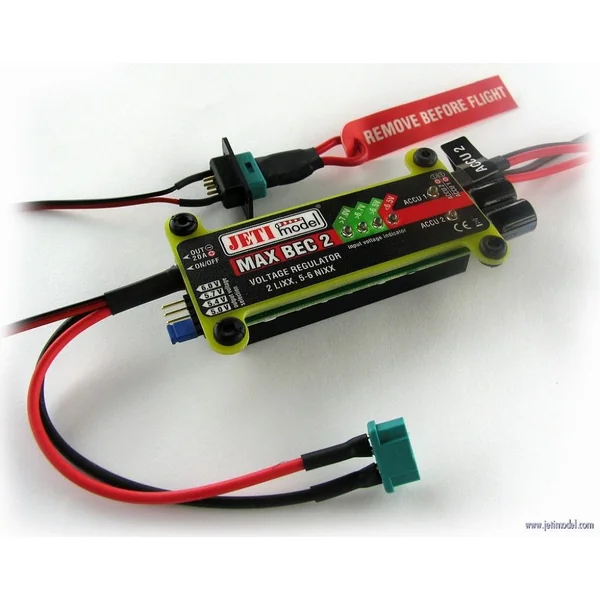 Max Bec 2 Jeti : Régulateur de tension. Alimentation du récepteur aux servos à partir d’une batterie Lipo en 2S 7.4v ou d’un accu NIMH. Tension linéaire, réglable et adéquate de 5v à 6v. Le max BEC 2 Jeti vous donnera également une indication de la capacité utilisés de la batterie avec quatre Led de témoins. Poids : 85g Dimension : 100x29x19mm