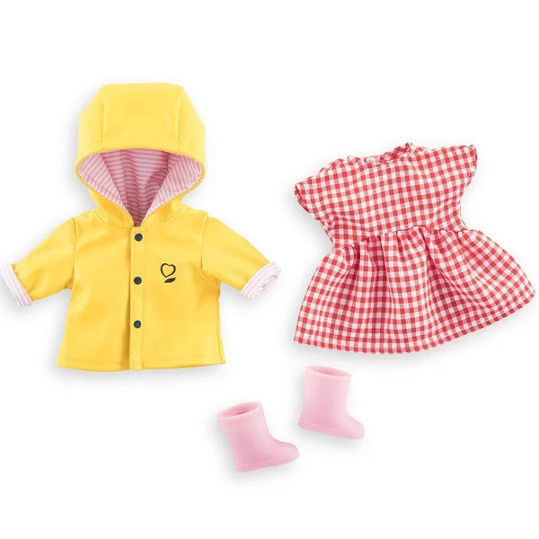 Coffret Vive la Pluie, une tenue complète avec accessoires pour habiller sa poupée ma Corolle de 36 cm et affronter avec élégance les intempéries ! Contient 4 accessoires : 1 Ciré jaune, 1 Robe à carreaux vichy rouge et blanc pour un look très vintage, 1 paire de lunettes de soleil rétro rose et 1 paire de bottes de pluie rose à paillettes. Ces vêtements ne peuvent pas être portés par un grand poupon de 36 cm.