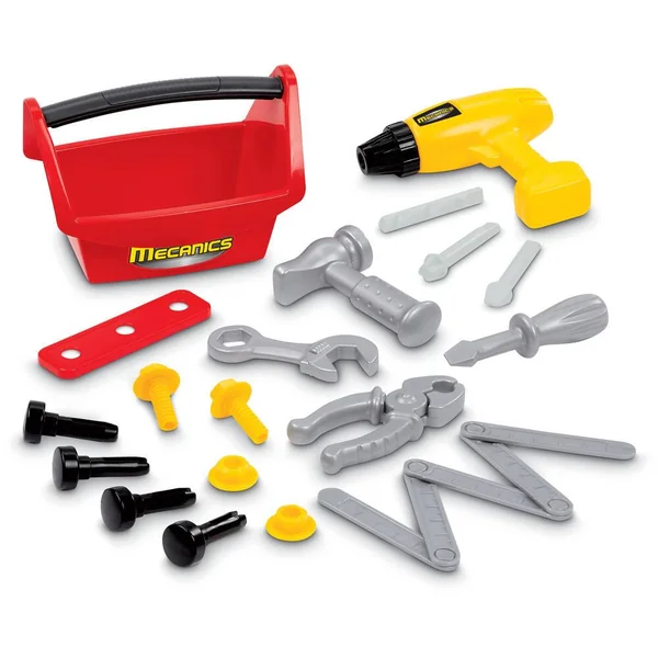 Un établi rempli d’accessoires comme des outils, des clous, une perceuse radiale avec ses 3 mèches interchangeables et une boite à outils. Tous ces accessoires permettent aux plus petits de jouer à taper et bricoler en toute sécurité. 16 pièces.