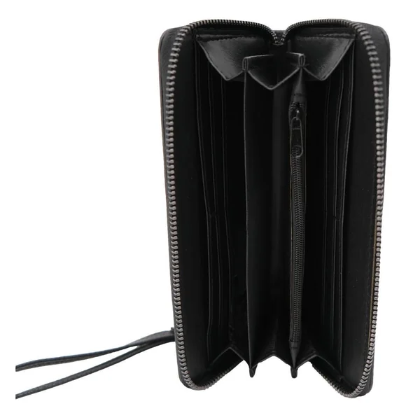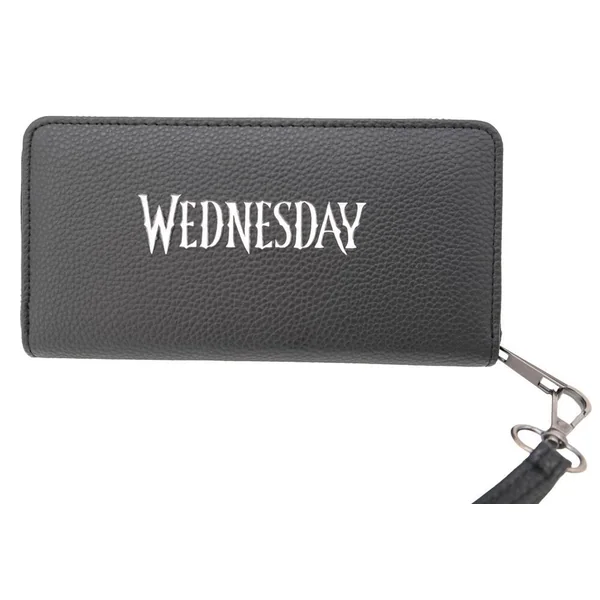 Portefeuille Mercredi (en anglais Wednesday). Zippé. En polyuréthane (PU). Contour imprimé et gaufré. Compartiments intérieurs pour billets et cartes, logo gravé, avec poignée.