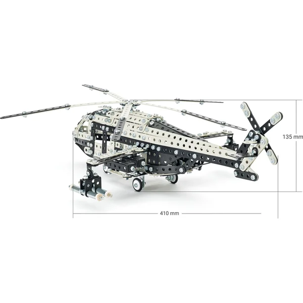 Ce set unique est l’outil idéal pour développer les compétences techniques et l’imagination des enfants. Grâce aux pièces métalliques, les petits constructeurs peuvent assembler un hélicoptère de combat Mil Mi-24. Le kit contient des pièces métalliques de haute qualité qui se fixent facilement avec des vis, favorisant le développement de la motricité fine, de la pensée logique et de la concentration.
