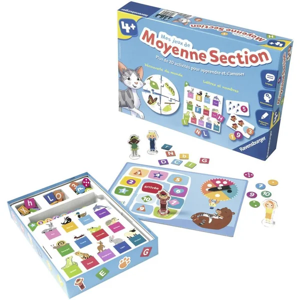 Mes jeux de moyenne section rassemblent dans un coffret très complet et multi-thèmes plus de 20 activités différentes pour découvrir la deuxième année de maternelle. Toutes les thématiques y sont abordées : l’apprentissage des lettres, des chiffres, mais aussi les animaux, les formes, les couleurs, le corps humain, le monde végétal, les gestes de l’écriture, et d’autres surprises à découvrir ! Il évolue ainsi à travers un matériel riche, coloré et aux illustrations joyeuses, pour acquérir les fondamentaux et progresser tout en s’amusant. Pour une partie de 3 ou de 20 minutes, seul ou avec des amis, le coffret se prête à toutes les occasions de jeu. Grâce à son astucieux système de planches à onglets et son grand plateau, le jeu est facile à installer, prêt à jouer et facile à ranger. Ce produit est composé de matériaux issus de forêts bien gérées certifiées FSC®, de matériaux recyclés et de matériaux issus d’autres sources contrôlées (FSC-C111262).