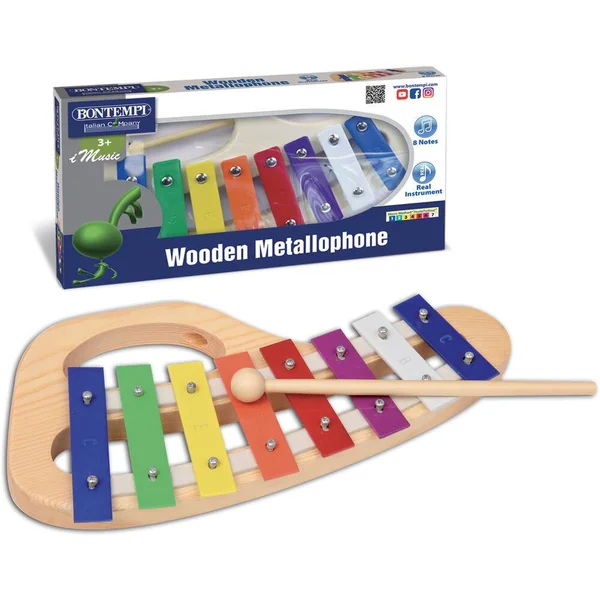 Métallophone en bois. Avec 8 notes métalliques et colorées. Livré avec une baguette.