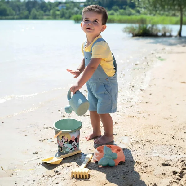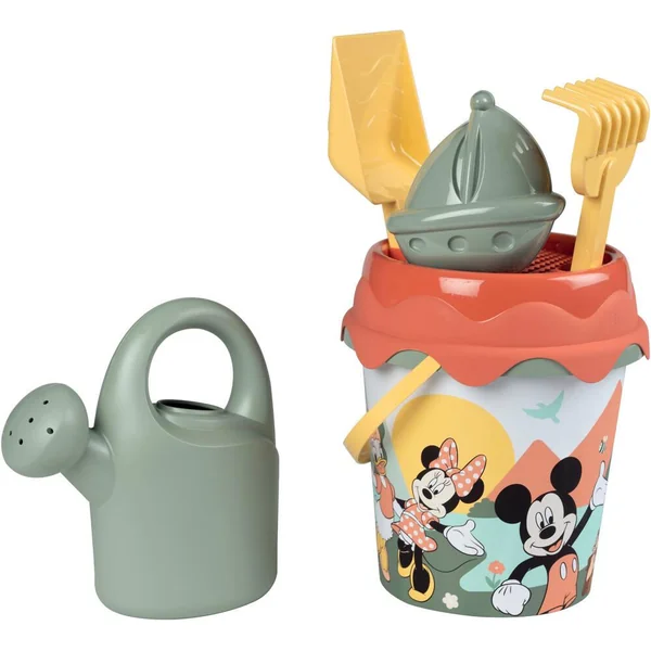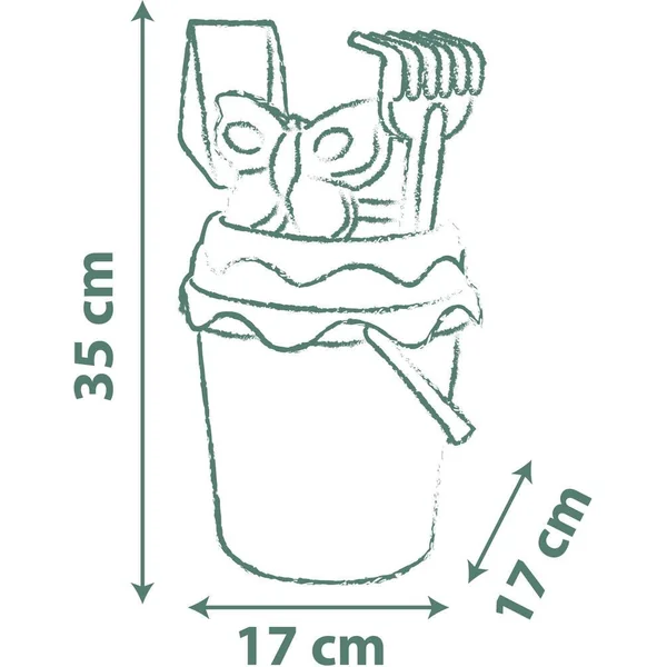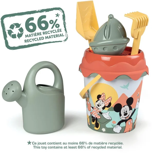 Set composé d’un seau de plage (diamètre 17cm) décoré avec un IML, d’une doublette (pelle + râteau), d’un arrosoir, d’un moule à sable, et d’un tamis. Ce jouet contient au moins 66% de matière recyclée.