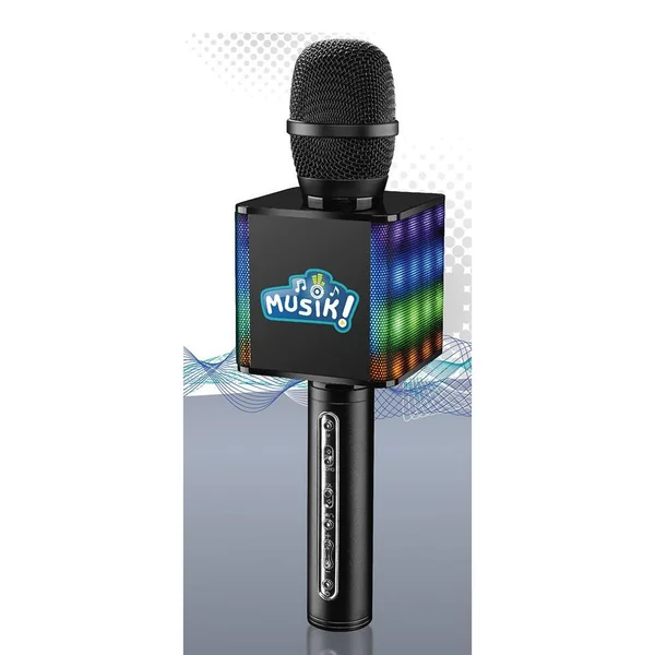 Microphone haut-parleur avec lumières LED clignotantes. Connexion Bluetooth : version 4.2. Portée jusqu’à 10 mètres. Jusqu’à 5 heures de temps de jeu / lecture. Fonction écho. Mode de modification vocale : changement de la voix. Lecteur de carte micro SD. Clignotement des lumières en rythme : avec marche/arrêt des fonctions LED. Fréquence classe 1 : 20Hz – 20KHz. Batterie rechargeable haute capacité incluse : 3.7V/2200 mAh Li-ion. Câble USB de charge inclus. Temps de charge : jusqu’à 3 heures. Rapport signal sur bruit : environ 95 dB. Impédance : 3 ohms. Notice incluse. Carte micro SD non fournie. Le format des cartes doit être FAT. La musique doit être stockée dans des fichiers MP, WMA ou WAV. Réglage du volume : micro et haut-parleur.