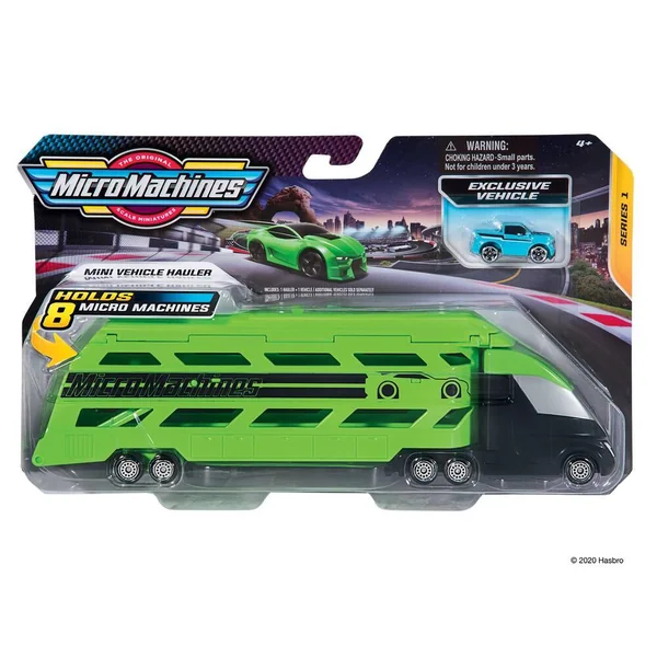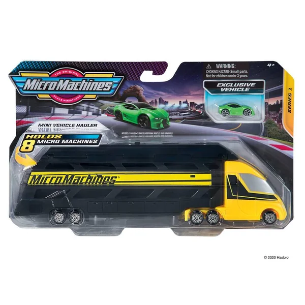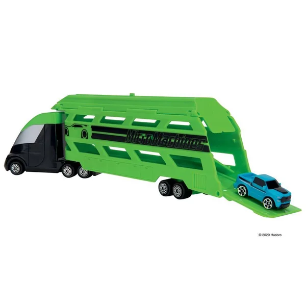 Contient un transporteur de véhicule de 25 cm environ et 1 véhicule de 2.5 cm. Véhicules roues libres en plastique. Plusieurs modèles assortis. Charge et remorque ! Transporte tes véhicules Micro Machines avec ce transporteur de véhicules. Ouvre le toit de la remorque ou abaisse la rampe arrière pour charger jusqu’à 8 véhicules dans le transporteur. Tout est chargé ? Alors, allez-y ! Livré avec 1 véhicule Micro Machine, les autres véhicules étant vendus séparément. Modèle selon disponibilité.