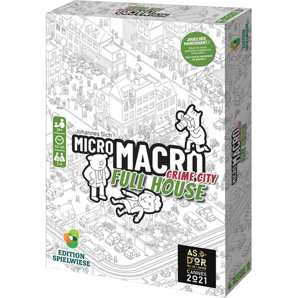 Bienvenue à Crime City, la ville où le crime menace à chaque coin de rue. Secrets macabres, vols sournois et meurtres de sang-froid sont monnaie courante par ici. Full House est le second volet de la série MicroMacro : Crime City. C‘est une nouvelle partie de la ville, avec ses 16 enquêtes à mener, qui vous ouvre les bras ! De 1 à 4 joueurs. Durée de la partie 15 à 45 minutes.