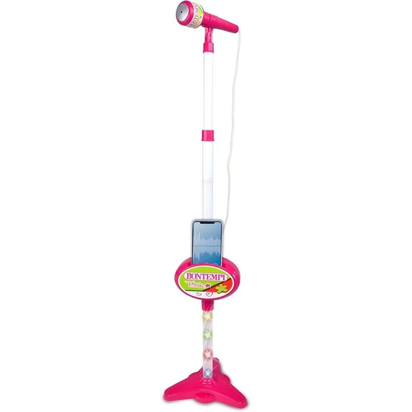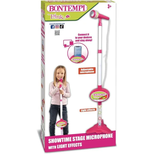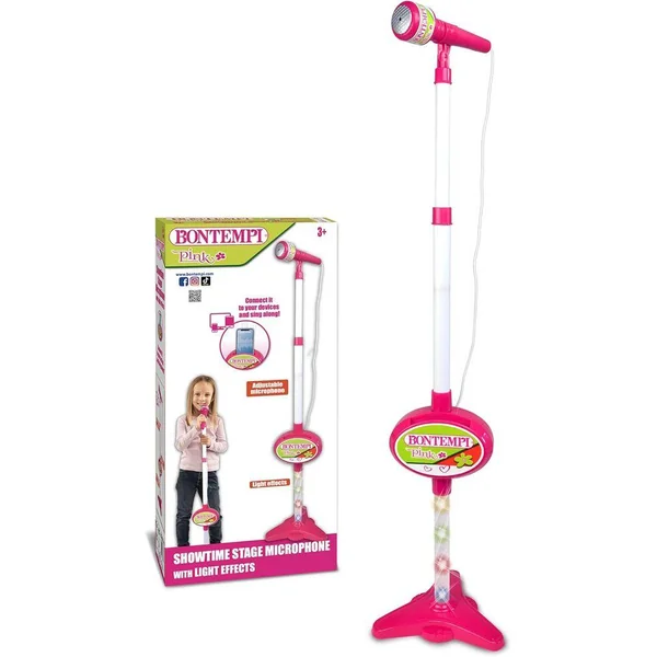 Microphone de théâtre • Tige de micro réglable en hauteur • Micro réglable • Effets sifflement, ovation et applaudissements • Prise micro • Emplacement porte-smartphone • Connexion à une source musicale externe (lecteur de MP3, tablet, smartphone..) – câble inclus • Alim.: 3 piles à 1,5V R6/AA (non founies) • Dim.: 210x210x1100 mm –