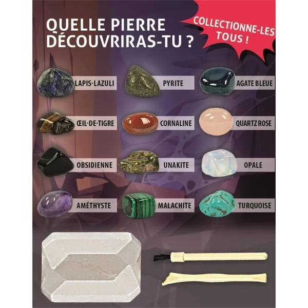 Fouille le bloc et découvre de magnifiques pierres précieuses à collectionner ! Chaque brique dissimule un minéral différent. Le coffret contient un marteau et un burin pour creuser dans la roche et faire apparaître les pierres précieuses