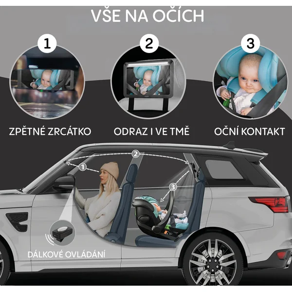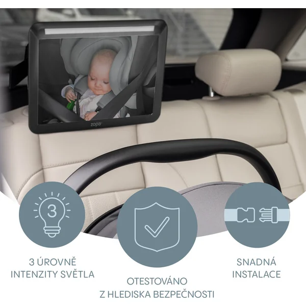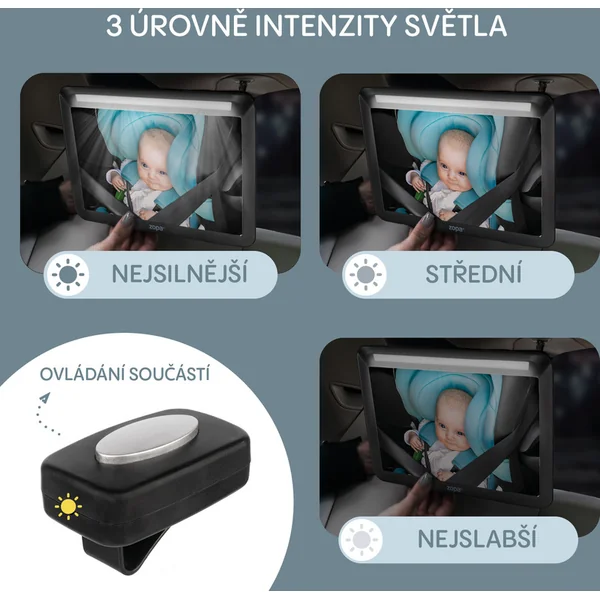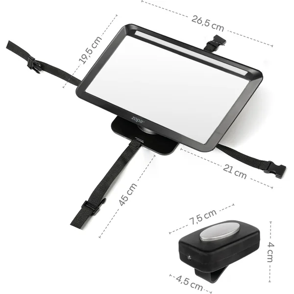 Le miroir offre trois niveaux d’intensité lumineuse et se fixe facilement à l’appui-tête à l’aide de sangles réglables. Il est fabriqué à partir de matériaux durables pour minimiser le risque de casse, et grâce à son design moderne, il s’intègre parfaitement à l’intérieur de tout véhicule. La télécommande et la longue durée de vie des batteries vous garantissent du confort même lors de longs trajets.