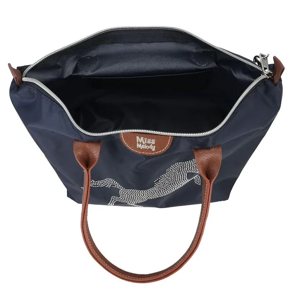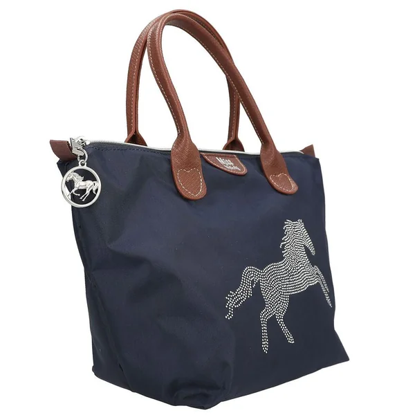 Le devant de ce petit sac à main shopper bleu foncé de Miss Melody est orné de mini-rivets argentés qui forment un cheval en galop. Avec des anses en cuir végan marron, une petite poche intérieure et un pendentif argenté en forme de pièce de monnaie avec un motif de cheval qui est accroché à la fermeture éclair. Matière principale : 100 % polyester ; Revêtement : 100 % PU