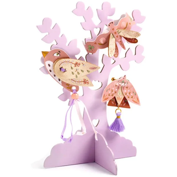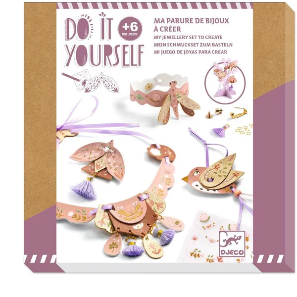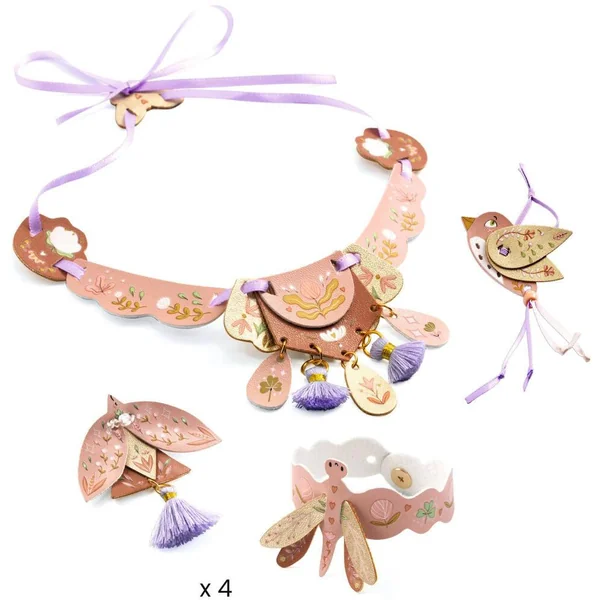 Un kit créatif pour réaliser une parure de bijoux raffinée en cuir synthétique, composée d’un collier, d’un bracelet, d’une broche et d’un bijou à cheveux. À l’aide d’un crayon, l’enfant frotte les décalcomanies pour les transférer sur les pièces en cuir en suivant les modèles proposés. Puis il assemble chaque bijou à l’aide des rubans, élastiques, fermoir, et les enrichit de pompons. Une délicate parure est ainsi réalisée, et n’a plus qu’à être portée. Lorsque la journée est terminée, le porte-bijoux permet de les accrocher en attendant le lendemain !