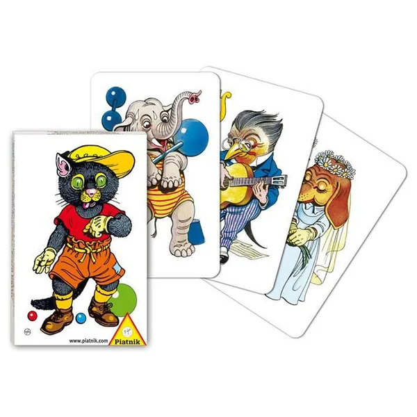 Un Mistigri amusant. But du jeu : Ne pas avoir en main le mistigri en fin de partie. Règle du jeu : Distribuer toutes les cartes. Chaque joueur extrait les paires de son jeu. A tour de rôle chacun présente ses cartes faces cachées à son voisin qui en choisit une. Poser les paires ainsi formées. Le joueur possédant le mistigri en fin de partie a perdu. Peut être utilisé aussi comme jeu de mémo.