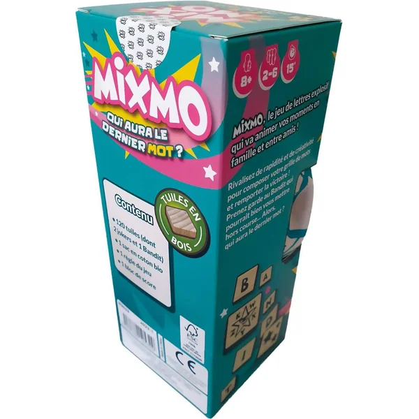 Mixmo, le jeu de lettres explosif qui va animer vos moments en famille et entre amis. Le jeu de lettres de Sly & Frog est de retour dans un pack et un format renouvelés, parfaits pour se retrouver entre amis pour un moment amusant. Préparez vous à un rythme effréné. Un jeu de lettres pour tous. Des parties courtes et pleines de rebondissements ! Ce jeu de Mixmo est composé de tuiles en bois. 1 sac de rangement élégant – 120 jetons gravés de qualité – 1 livret de règles du jeu – De 2 à 6 joueurs. Temps : 15 min.