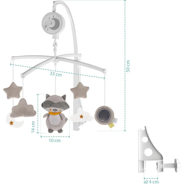 Le mobile est conçu pour des lits standards et son installation est très simple. Le mécanisme musical à remonter fonctionne sans piles. Les jouets en peluche doux en matériau de qualité, non toxique, très agréable au toucher, peuvent être facilement détachés du mobile et peuvent également devenir de petits amis câlins.