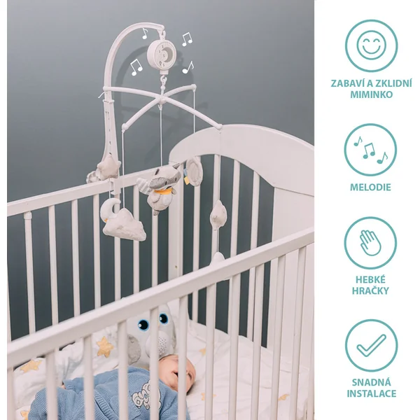 Le mobile est conçu pour des lits standards et son montage est très simple. Le mécanisme musical à remonter fonctionne sans piles. Les jouets en peluche doux en matériau de qualité et non toxique, très agréables au toucher, peuvent être facilement détachés du mobile et peuvent également devenir de petits amis câlins.