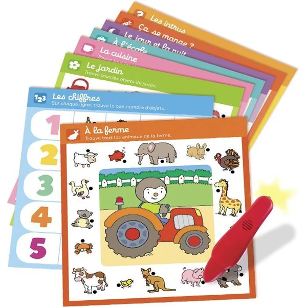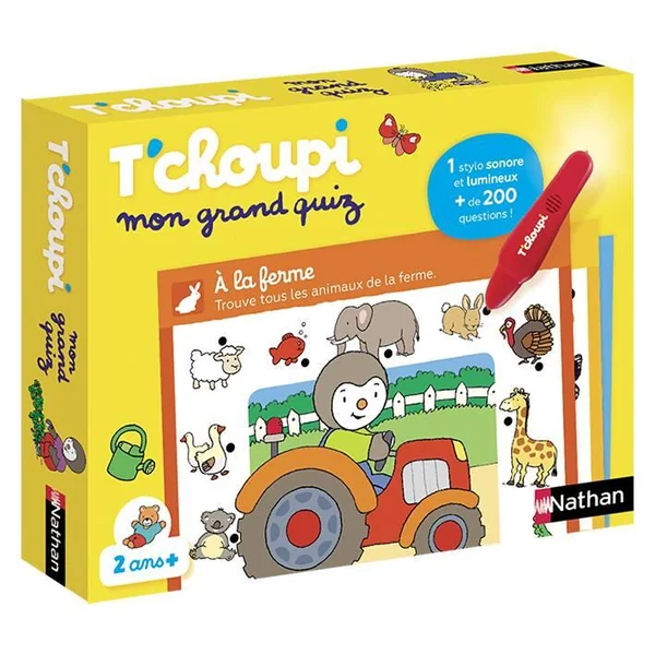 Un jeu électronique de questions-réponses pour découvrir l’univers de T’choupi. L’enfant apprend à associer les pièces aux objets de la maison, les couleurs, les quantités…A l’aide du stylo l’enfant répond aux questions. Si la réponse est bonne, le stylo s’allume! 12 thèmes.