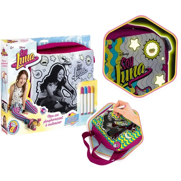 Découvre Soy Luna, le nouveau phénomène tweens de Disney ! Soy Luna est une jeune fille dynamique passionnée par le chant et championne de roller. Customise ton sac Soy Luna en utilisant les 4 feutres pour colorier. Personnalise le avec les pin’s. Ton sac est aussi fluorescent.