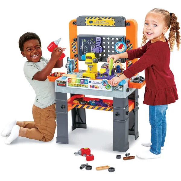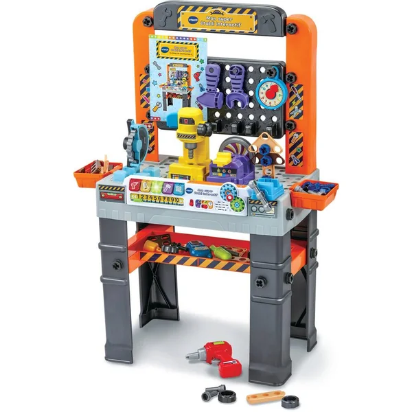 Le premier établi pour réaliser tous les travaux de bricolage en un tour de main ! Premier projet : construire son établi ! À l’aide de 109 pièces incluses, l’enfant construit pas à pas son établi et utilise les 61 pièces de jeu (boulons, vis, outils, accessoires, machines…) pour réaliser de nombreux travaux de bricolage. Les 3 machines (scie circulaire, ponceuse et perceuse) sont reconnues lorsqu’on les positionne sur la zone électronique afin de déclencher des effets sonores réalistes. 3 modes de jeu et 5 boutons colorés permettent à l’enfant de découvrir les nombres, les couleurs et les outils, de répondre à des quiz et de jouer en musique. De nombreuses manipulations lui permettent de développer sa motricité fine tout en s’amusant. Le livret inclus guide l’enfant dans la réalisation de l’établi et lui propose 9 projets supplémentaires de construction en 2D ou 3D. Un panneau perforé pour ranger ses outils, trois zones de rangement et une zone de bricolage pour utiliser les outils et réaliser ses projets. Arrêt automatique et réglage du volume sonore. Pile de démonstration fournie
