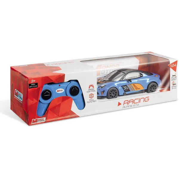 Réplique radiocommandée de l’Alpine A110 GT4. Échelle : 1/24ème (20cm). Commande « toutes directions » : avant, arrière, gauche et droite. Vitesse : 8 km/h. Fréquence : 27 ou 40MHz (selon disponibilité). Portée : 12 mètres (environ). La carrosserie « Lexan body » (plastique souple) permet de gagner en légèreté, pour un gain de performance. Fonctionne avec 3 piles LR6 / AA (non fournies) pour le véhicule, et 2 piles LR6 / AA (non fournies) pour la télécommande.