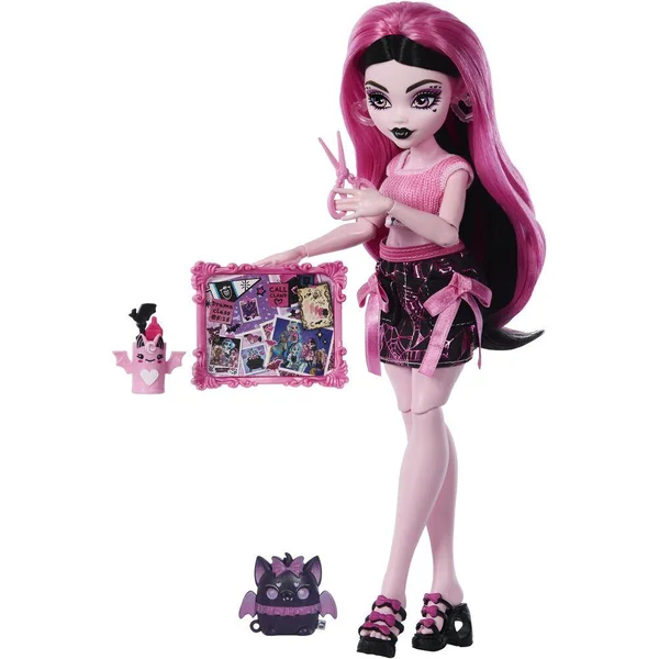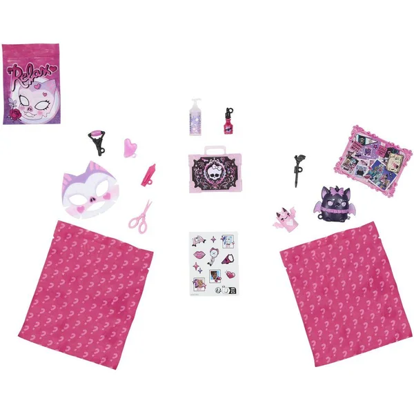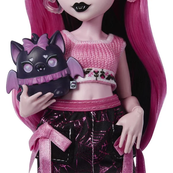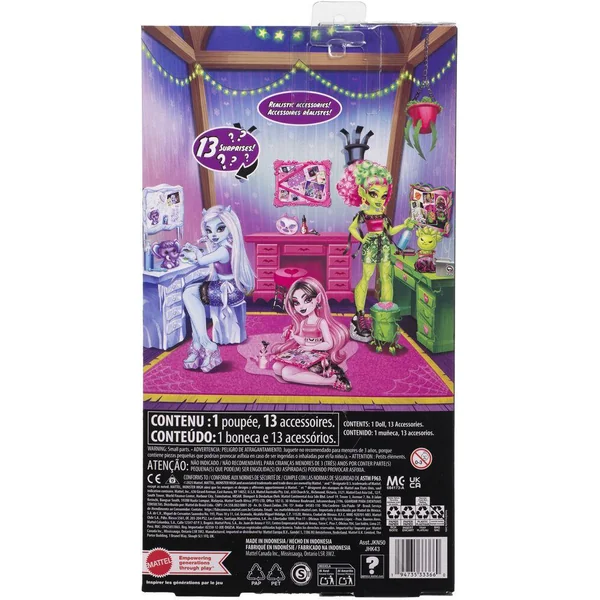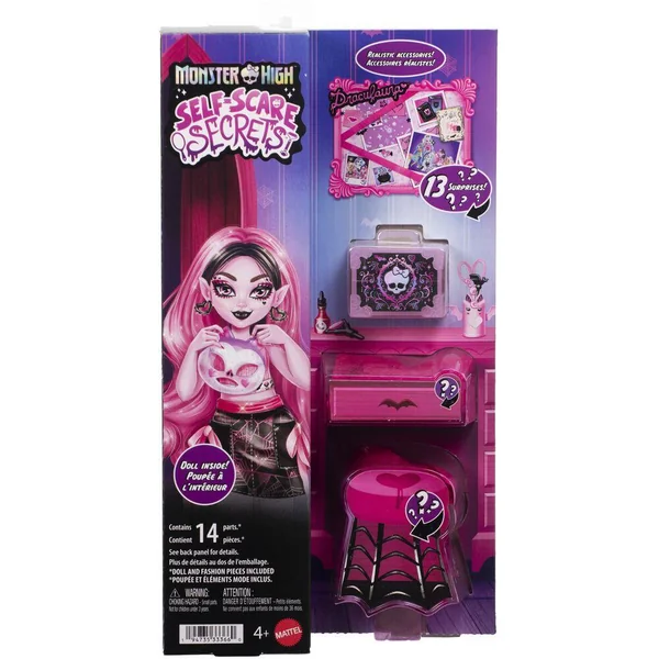 Le pack sert de décor de jeu pour recréer l’espace secret de Draculaura. À l’intérieur, 1 poupée articulée, 14 accessoires de beauté et 1 animal sont inclus.