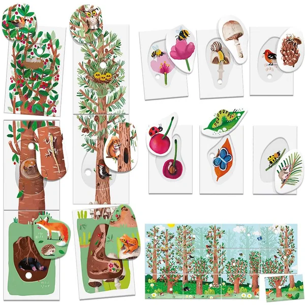Pars à la découverte des environnements naturels avec les flashcards à encastrements et apprends à classer les éléments qui les caractérisent : plantes, feuilles, fruits et petits animaux.