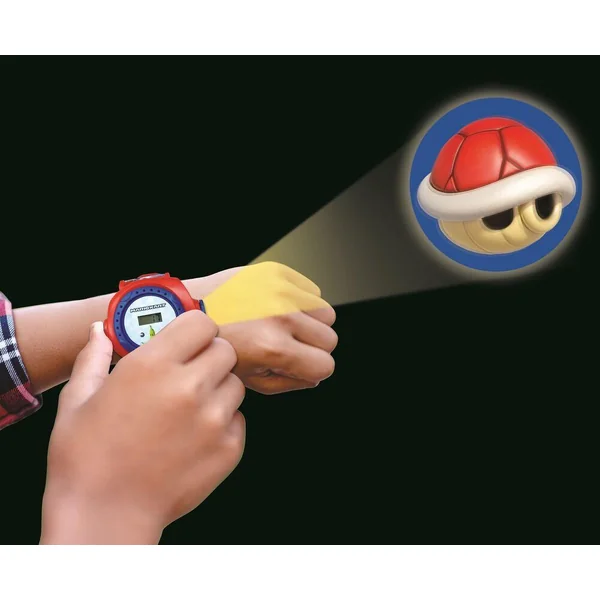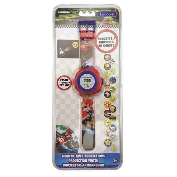 Une montre digitale avec design Mario Kart ! 20 images de l’univers dujeu vidéo à projeter où tu veux Communique avec tes amis en envoyant des messages codes avec tes projections préférées Bracelet ajustable, convient parfaitement aux petits poignets Anneau rotatif pour choisir l’image à projeter Affichage de l’heure et de la date Piles incluses