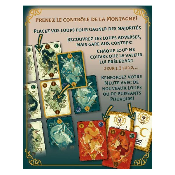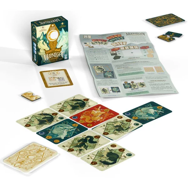 Moonlight – Le Territoire des Loups vous proposera d’incarner l’Alpha à la tête d’une meute de loups. Luttez pour le contrôle d’un territoire, en posant vos cartes au sein d’un tableau commun. Essayez d’obtenir des majorités sur chacune des lignes du tableau (4 par 3 ou 3 par 4) en plaçant stratégiquement vos cartes ou en recouvrant celles de l’adversaire.
