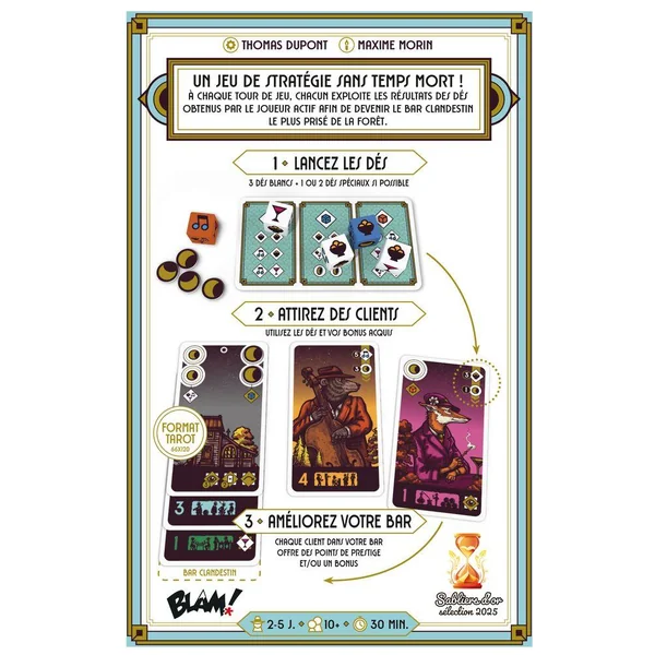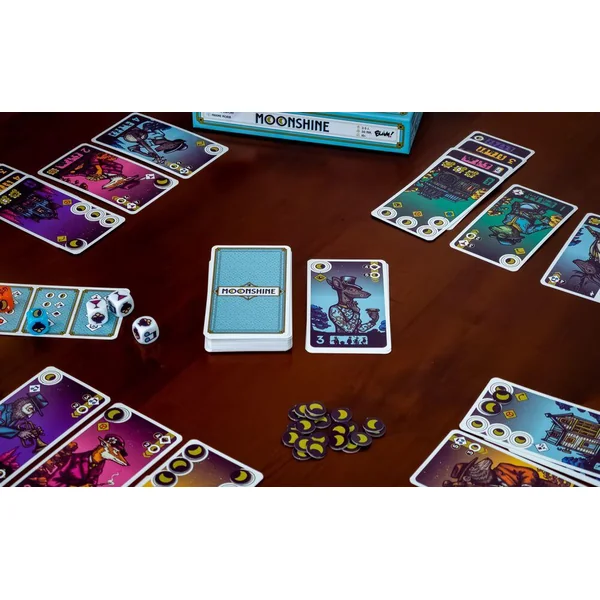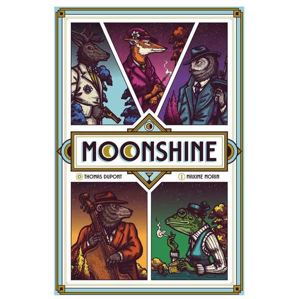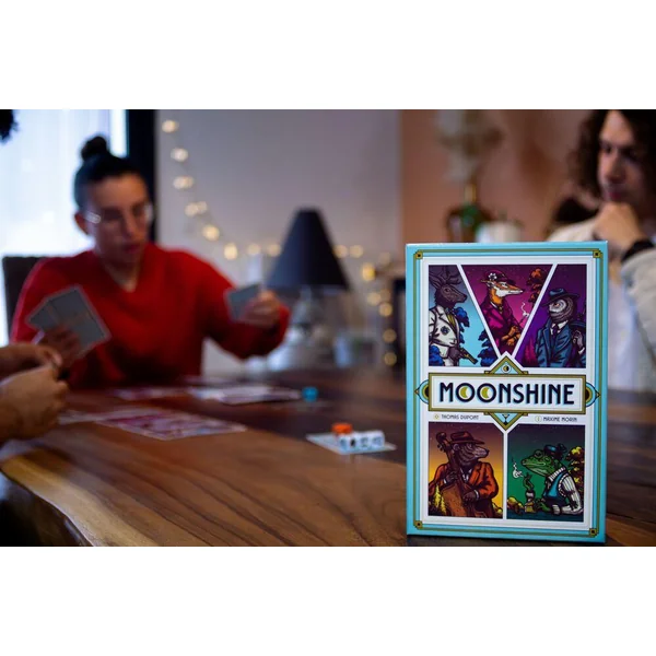 Dans Moonshine, plongez dans l’univers secret de la prohibition… A la tête d’un bar clandestin, tirez parti au mieux du partage des ressources interdites afin d’attirer des clients au pouvoir d’influence bien utile. Faites les meilleurs choix pour prospérer dans l’ombre et devenir l’adresse cachée la plus prestigieuse de la forêt ! Contenu : 76 cartes – 5 dés -30 jetons Nombre de joueurs 2 à 5. Durée de la partie 30 minutes.