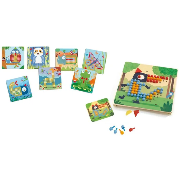 Mosaïco rigolo est un jeu de mosaïque pour les petits. Il permet de créer de fabuleux tableaux en complétant les 8 dessins avec les pions en couleur. Contenu : 1 planche en bois, 8 cartes, 203 picots.