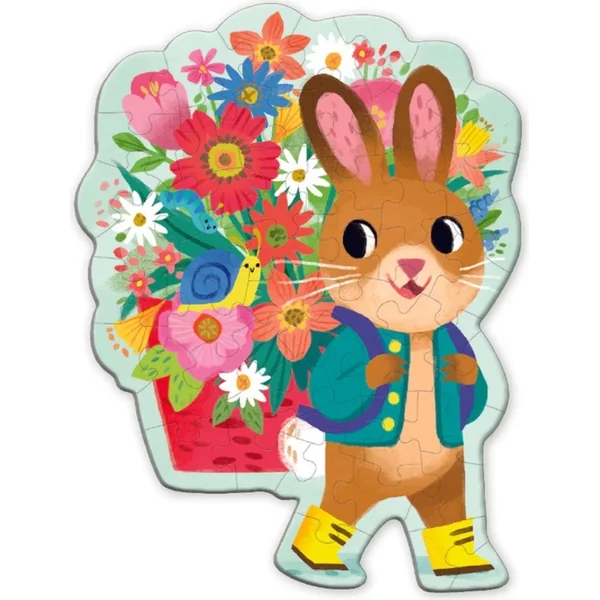 Puzzle intéressant de 48 pièces avec un petit lapin qui va féliciter pour une fête, un anniversaire ou Pâques.