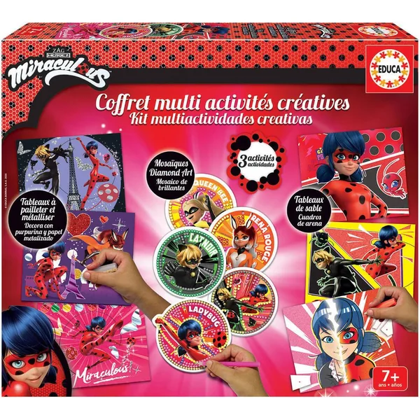 Un coffret multi activités pour réaliser de superbes créations avec Miraculous Ladybug ! Ce coffret te permet de réaliser différentes activités, toutes plus étincelantes les unes que les autres : Tableaux de sable, Tableaux paillettes et dorures, Mosaïque diamond art.