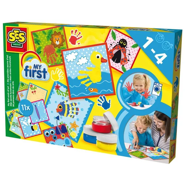 SES Ma première œuvre d’art, le meilleur moyen pour les enfants d’aborder la peinture. Le kit comprend d’attrayantes cartes imprimées qui indiquent l’endroit où placer ta main ou ton pied. Étale de la peinture sur ta main et place-la sur la carte. Ajoute la touche finale avec des détails imprimés supplémentaires. Le résultat est toujours impressionnant !