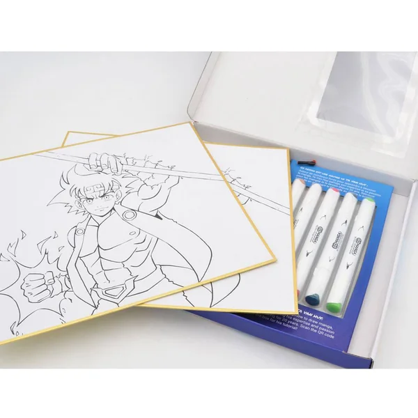 Kit d’initiation aux mangas. Simple, complet, ludique, il offre le plaisir de réussir la mise en couleur de son 1er manga…Contenu du kit: 2 Shikishi (Planches à dessiner pré-imprimées), 5 marqueurs pour Mangaka, pointe pinceau + pointe fine, 5 couleurs différentes par modèle, 1 tuto vidéo en pas à pas.