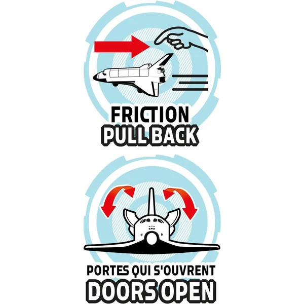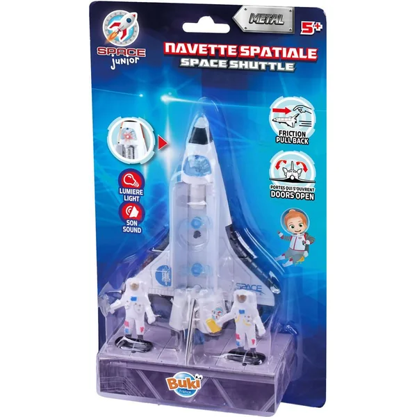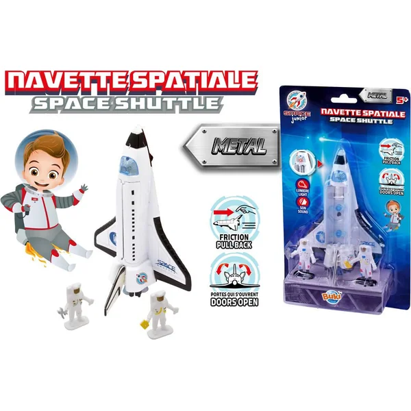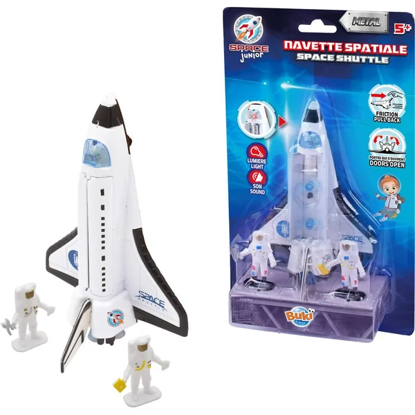 Une navette spatiale en métal de 15cm. Son système à friction permet de la faire rouler vite ! Ses portes s’ouvrent et lorsqu’on appuie sur le bouton noir, lumière et son de décollage s’activent.